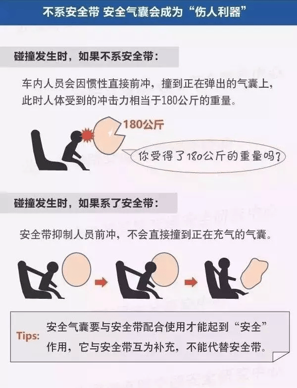据调查发现,安全带加安全气囊的有效保护率为65%,仅使用安全带,有效保护率为45%至50%,而仅使用安全气囊,有效保护率只有23%。不系安全带,有再多气囊都没用。